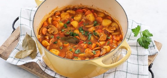 Laat de vegetarische stoofschotel met de deksel gedeeltelijk op de pan ca. half uur minuten zachtjes pruttelen tot de aardappeltjes gaar zijn.