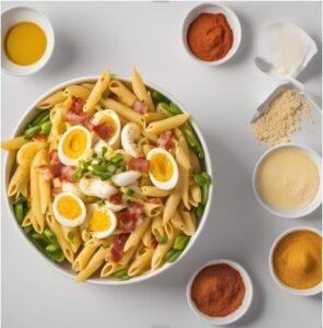 7. Doe de penne, de eieren, het ontbijtspek en als laatste het bosuitje door de saus.