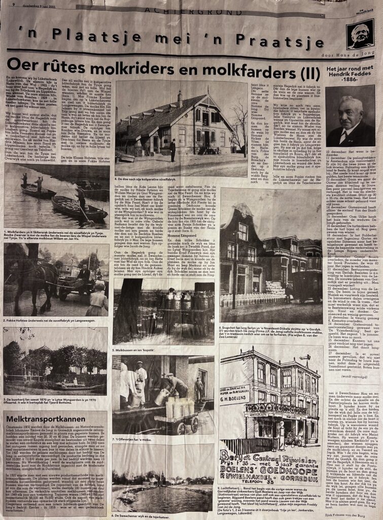 Regelmatig rijden er door Langezwaag grote witte tankauto’s die om de drie dagen gekoelde melk van 4 á 5 graden Celsius ophalen bij de elf boeren die hier elke dag 1.200 koeien melken. Dat ging er vroeger wel anders aan toe. Toen rond de vorige eeuwwisseling in bijna elk dorp zuivelfabrieken werden gesticht, begon ook het transport van melk van boerderij naar fabriek een rol te spelen in het dagelijks leven. Wat nu in tankauto’s van 30.000 liter wordt vervoerd, gebeurde toen in melkbussen van 30 liter. We kennen de melkbussen nu nog van het jaarlijkse carbidschieten op oudjaarsdag. Deze ‘melktransportkannen’ zoals ze werden genoemd, werden gemaakt in de Melkbussen- en Metaalwarenfabriek van Johannes Ymkes de Jong (Jo) in Gorredijk. Deze fabriek (in de volksmond ‘It konefabriek’ genoemd) is er nog steeds. Tot ongeveer 1980 werden hier jaarlijks zo’n 80.000 melkbussen gemaakt. Heden ten dage is de fabriek een belangrijke producent van roestvrijstalen biertanks en waterboilers voor verwarmingssystemen.