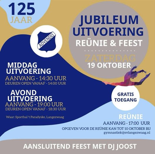 Vol trots presenteren wij op zaterdag 19 oktober onze uitvoering. Advendo bestaat 125 jaar, dat betekent een uitvoering (keer 2 zelfs ), een reünie en aansluitend een feest met DJ Joost!