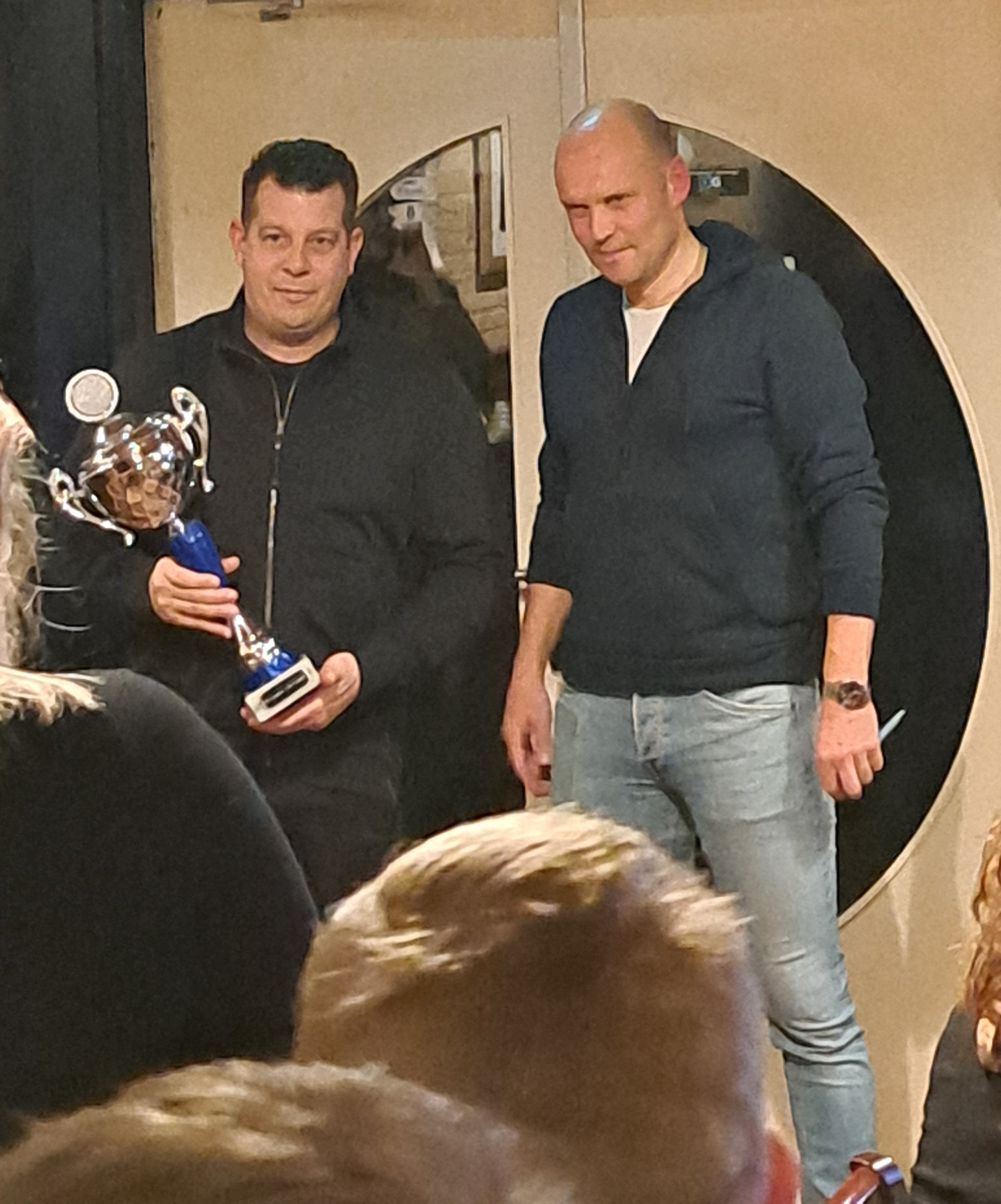 Op de foto reikt Klaas Oeds Huisman namens de sponsorcommissie de wisselbeker uit aan Marc Boersma van Wubben Noord.